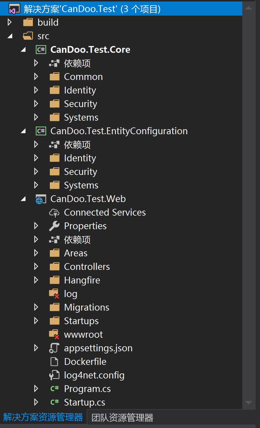 1、打开解决方案CanDoo.Test.sln后,各个工程之间的引用关系已配置好,osharp框架的类库已引用 nuget.org 上的相应版本,并将自动还原好