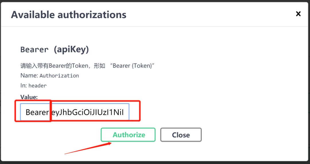 1、回到Swagger最顶部,找到绿色的文字Authorize,点击后在弹出窗口的Value中输入Bearer加登录是反馈的Data