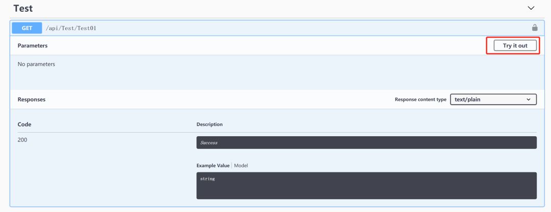 1、将系统运行起来后,看到Swagger界面,找/api/Test/Test01,点击后展开查看接口信息