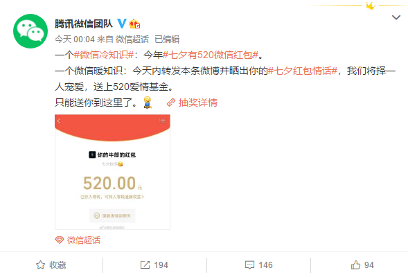 8月25日讯,腾讯微信团队昨天通过官方微博提醒,七夕节期间,微信红包的上限提高到了520元。从昨天0点开始,一直持续到23:59,微信普通红包的单个金额上限由 200 元上调到 520 元。(PingWest品玩)