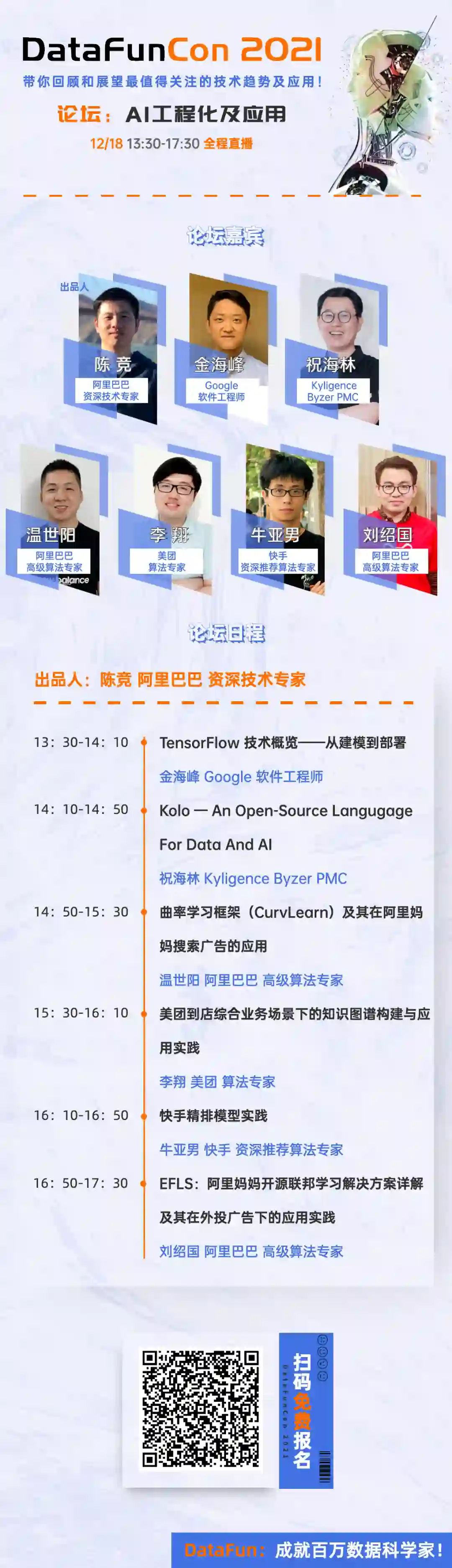 AI工程化及应用:过去7年,以深度学习为代表AI技术浪潮席卷了整个互联网,算法和工程的持续合作创新将深度学习、图学习、强化学习等多项AI技术大规模应用到互联网各个业务场景,带来了巨大的业务红利,并推动分布式训练引擎、AI Serving、端到端建模等AI工程架构的巨大发展,成为支撑算法迭代的基石。进入到2021,深度学习的创新已然进入深水区,一方面AI工程化技术在更大规模、更复杂、更通用上持续演进,以支持头部场景迭代并推进AI普惠;另一方面新兴场景与AI技术的结合催生了非常多创新的算法解决方案。为此在我们将在AI工程化与应用这个Session,与大家一起探讨交流业界在算法端到端建模迭代、全流程机器学习平台、大规模排序、知识图谱、曲率学习、联邦学习等多个方面最新的AI工程实践。