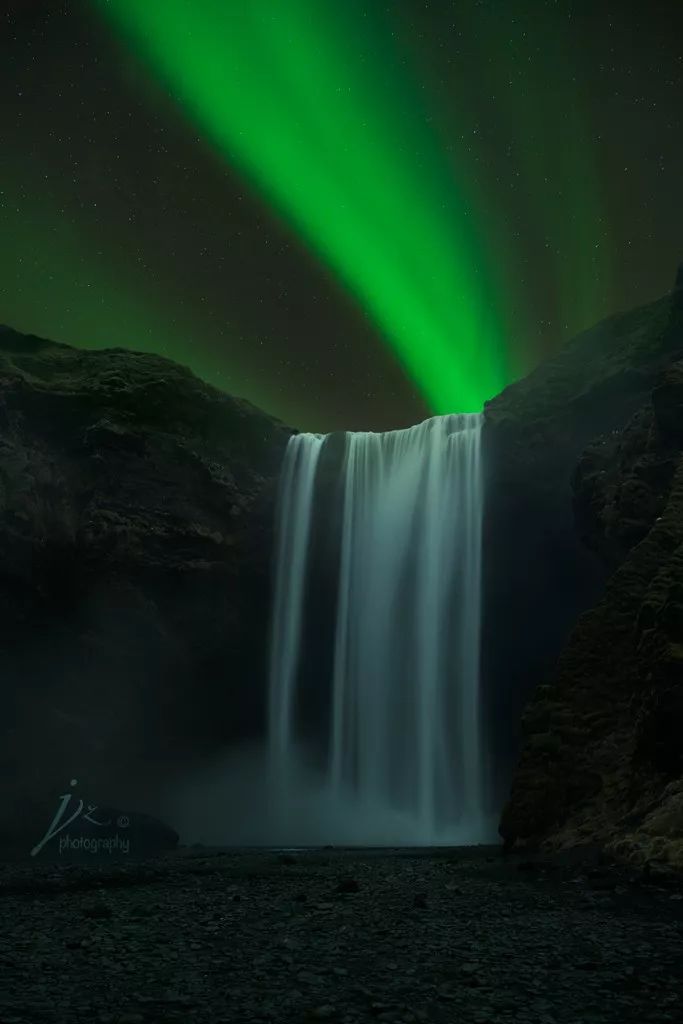 就在我犹豫不决的时候,在天边极近瀑布的地方出现了一条带状的荧光闪动,位置恰恰与瀑布平行。我即时决定不采用极光占大面积画面的传统构图,果断放弃了天空中前上方的极光,只取天边的那一条横向极光,而留下更多的空间给瀑布,这样既可以充分展示瀑布的形态,又可以留有想象的空间,那有如一条绿丝带的极光起到点到为止的作用,让读者自己去想象夜空的美丽。