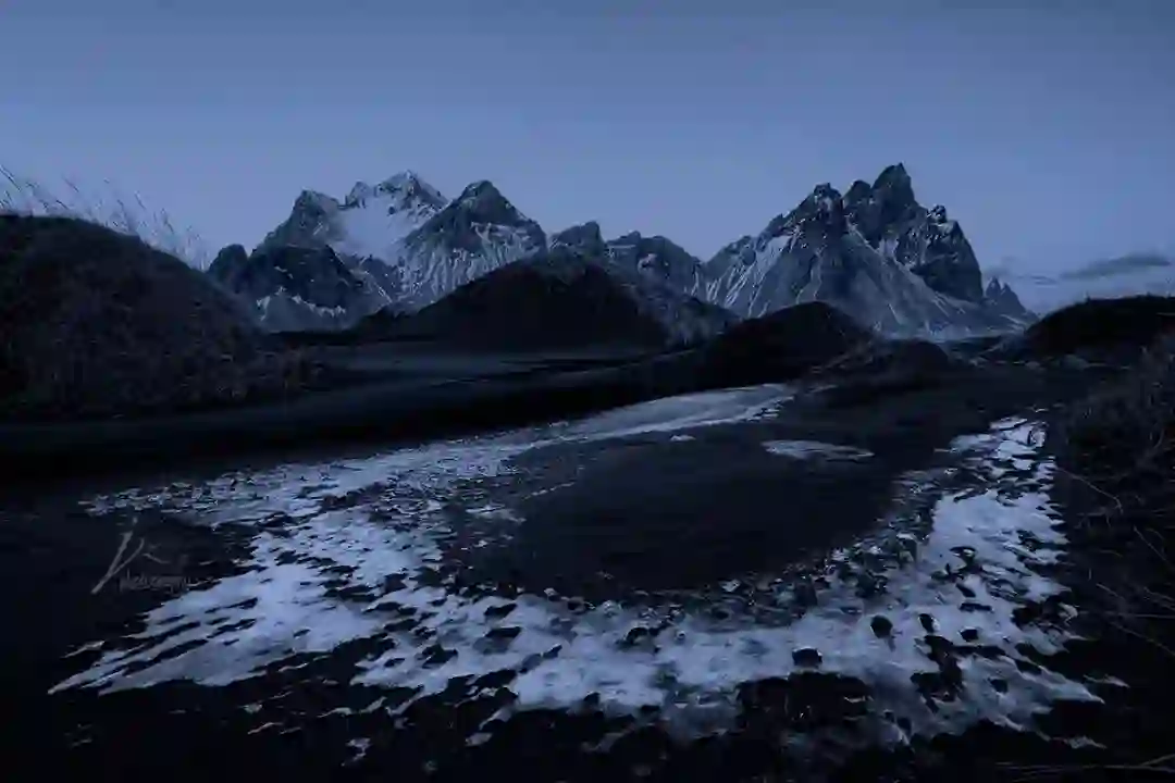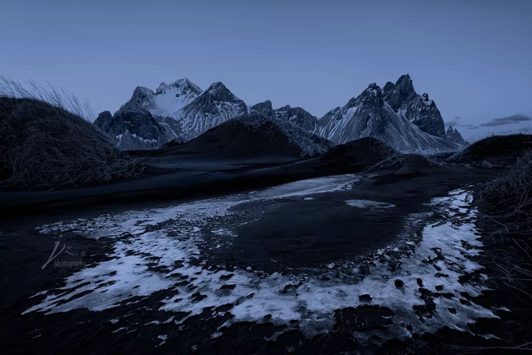由于当天月落时间为上午10:04, 月出要等到转天早上4:50, 这就意味着整晚天空中是没有月亮的。没有月光的照明,晚上必然是漆黑一片,这就需要对拍摄点提前熟悉。是日下午的拍摄计划是冰岛南部的蝙蝠山 (Vestrahorn) 日落, 所以当晚的极光拍摄也定在这里,这样拍摄日落的同时就可以踩点,为夜晚的极光拍摄做好准备。