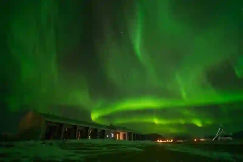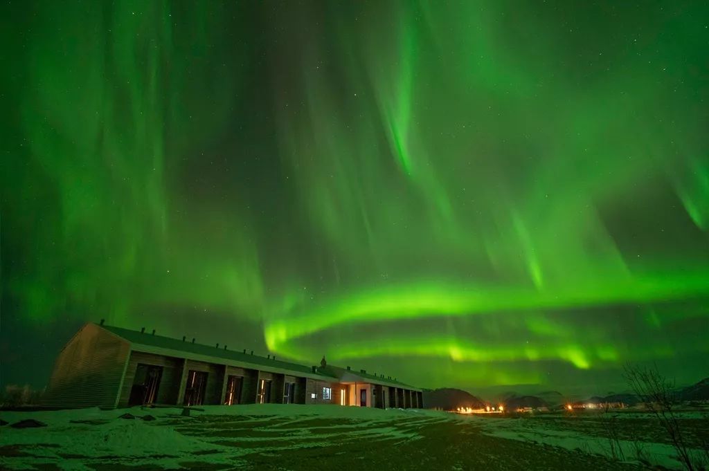回到住处稍事休息,我再次查询极光指数,此时极光强度又呈上升趋势。走出房间,绿精灵在漆黑的夜色中狂舞,仿佛是烟花炸裂般飞舞在天空。虽然这些年看过的美景无数,但此刻的神奇夜空仍然令我窒息。我奢侈地许给自己半分钟的时间,痴痴地望着这不属于人间的景色,独享这一刻的绝美。然后飞速跑回房间,拿出相机,开始执行我作为摄影师的使命。