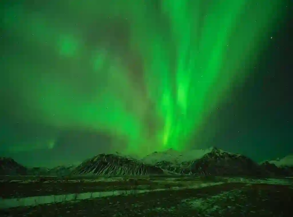 拍摄完日落,离天完全黑下来还有一个多小时的时间。蝙蝠山的所在地霍芬(Höfn),是冰岛著名的龙虾产地,所以又有龙虾镇的美称。队员们决定趁这个时间去品尝美食,但摄影师终归还是心系极光,吃饭的同时不忘随时查询极光指数,预测显示极光指数呈上升趋势。我跑到餐馆外眺望远方天空,此时已有一条微弱的绿光带肉眼可见,于是匆匆离开,带队奔赴蝙蝠山。