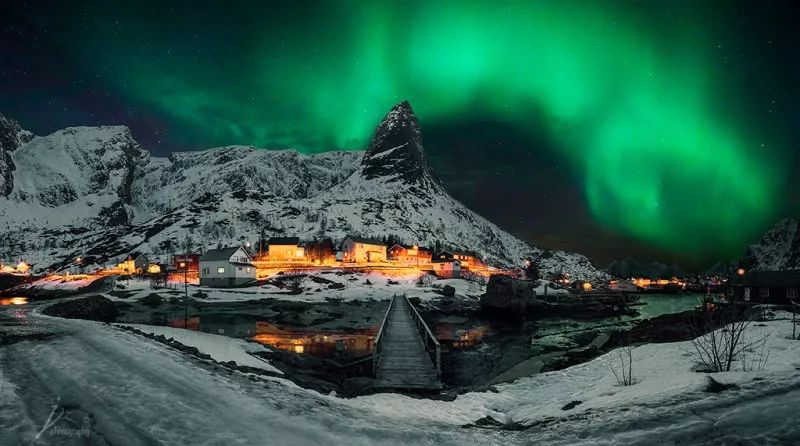 《雪山与极光》摄于挪威罗佛敦群岛的Reine, 那晚在冰天雪地中坚守了三个小时,身体冻得越来越僵硬,绝望中遥望夜空山顶的附近忽然好像有荧光闪闪,直到越发清晰,飞舞的极光就这样盘旋在山头,轻盈飘荡,如入幻境。 黑色的夜空像一块巨大的幕布,极光女神在此独舞,醉天醉地。在空灵的雪野中望着这变幻极致的光影,虚幻又真实,使得所有的坚持和忍耐都变成一张稀世的入场券,这是上天给我执着等待的奖赏。