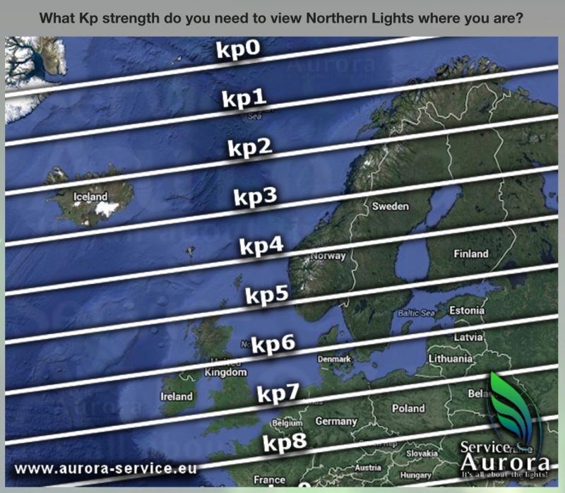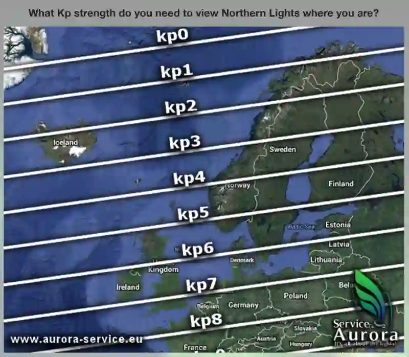 上张图显示出在欧洲各国,肉眼可见极光所需KP指数。例如,2-3级在冰岛可见,由于挪威/瑞典/芬兰国土狭长,2-3级的极光在北部地区可见,而南部地区则需等到3-5级才能观测到。再往南部的国家只有在7-8级左右极光大爆发时才有可能看到,几率极小。