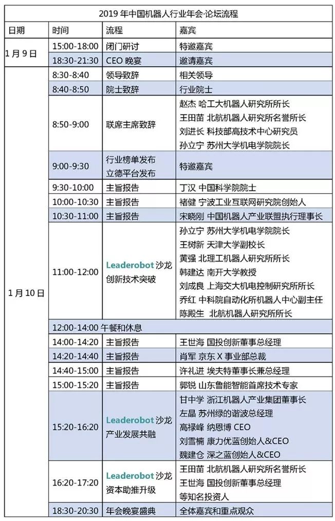 本届年会邀请了行业资深专家、企业家主持,特邀嘉宾围绕“推进机器人产业创新与协作共融”的年会主题,为在场五百余位行业嘉宾带来关于2018年中国机器人产业发展的深度分享和精彩研讨,为推进2019年中国机器人产业创新与协作共融做好规划。年会初步流程如下,以最终实际流程为准: