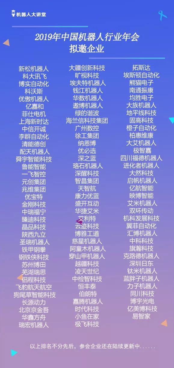 在这里,机器人大讲堂(立德共创服务平台)满怀感恩,感谢大家的一路相伴,同时愿意与大家一同携手,共同推动行业实现更快更好发展。2019年中国机器人行业年会这场年度盛宴,我们不见不散!