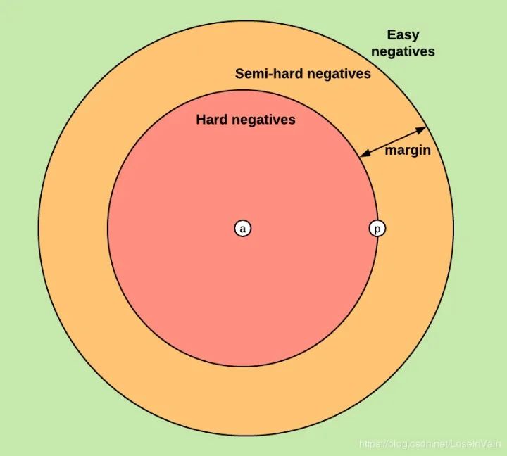 。在这种情况中,在嵌入空间(译者:指的是以嵌入特征作为表征的欧几里德空间,空间的每个基底都是一个特征维,一般是赋范空间)中,对比起正样本来说,负样本和锚点样本已经有足够的距离了(即是大于
