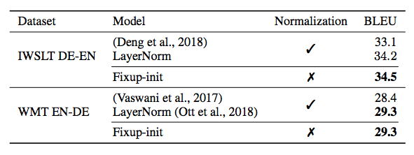 机器翻译:作者在机器翻译基准 IWSLT 和 WMT 上训练 Transformer 模型,但将层归一化替换成了 Fixup,结果发现新模型优于基线模型,且同样的架构输出结果却达到了新高。