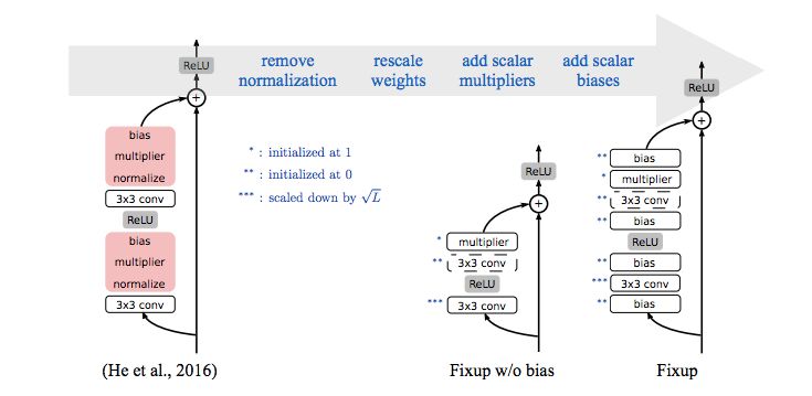 左图是 ResNet,红色为批归一化层。中间图是堆叠在一起也能稳定训练的简单 Fixup 网络(移除了偏置项)。右图是添加偏置项参数后的 Fixup。