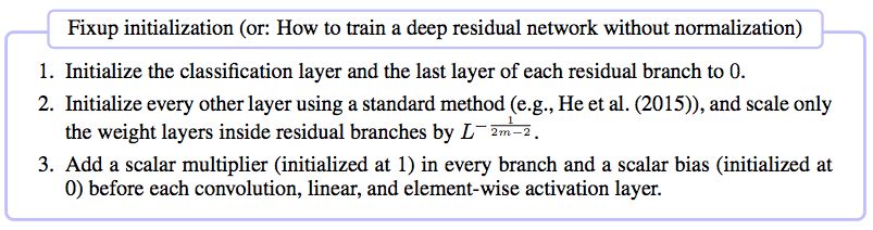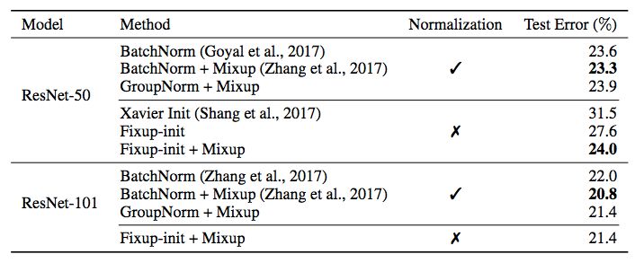 关于不使用归一化的模型训练,作者提出了一种新初始化方法 Fixup。通过调整网络架构对残差分支的标准初始化进行重缩放,Fixup 可使深度残差网络在不使用归一化技术的情况下以最大学习率进行稳定训练。