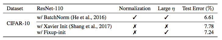 Fixup 能够在 CIFAR-10 上以高学习速率训练一个 110 层的深度残差网络,得到的测试集表现和利用批归一化训练的同结构网络效果相当。