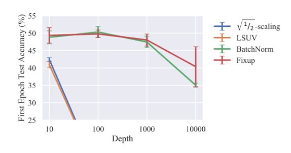 以默认学习率在 CIFAR-10 数据集上进行第一个 epoch 训练后,Fixup 的性能与批归一化不相上下,甚至对 10000 层的深度网络也是如此。