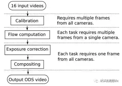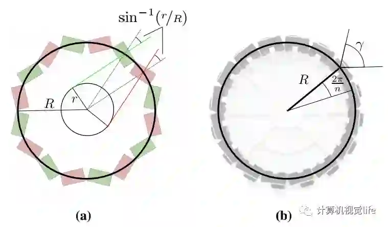 先来看看硬件设计方案。主要有如下两种设计方案:(a)切向设计和(b)径向设计。切向设计中一半相机负责立体全景图中的左视图,一半负责右视图。径向布局设计中每个相机同时负责左右视图中的一部分。径向设计只需要在相邻图像间进行插值,而切向设计需要间隔一个相机进行插值,这使得基线增大一倍,难度也更高。因此,径向设计更适合大圆盘半径而切向设计更适合于小圆盘半径。