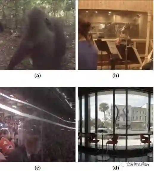 (a) 物体距离镜头特别近时,拼接会出错,图中大猩猩距离镜头大概15cm。(b) 细长的物体在光流计算中很容易被遗漏,这会导致图中麦克风杆的鬼影效果。 (c) 半透明的物体表面会产生变形. (d) 少部分情况下重复纹理区域的光流会出现误匹配。
