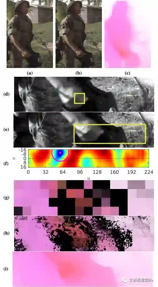 2、稠密光流场计算。该算法将水平方向的光流近似作为深度的倒数(视差)。该光流算法可以保持较清晰的边缘,如下图所示。(a)、(b)是输入的两帧,(c)是该方法得到的保持边界清晰的光流场。对(d)中(第1帧图)的一个小区域,在(e)中(第2帧图)较大范围内进行搜索并计算得到一个归一化的误差平方和(f)。根据块光流及其置信度图(g),从而得到用色彩、饱和度、明度表示的初始的光流(h),最后经过双边滤波等后处理方法得到最终边界清晰的光流场(i)。