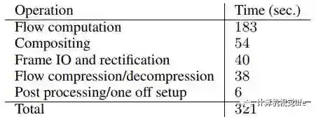 虽然两张图光流计算只需5s,但是一次同时输入16张图,前后向光流需要各算一次,所以主要的时间耗费在光流的计算上了。每张立体全景图平均处理时间分布如下图所示: