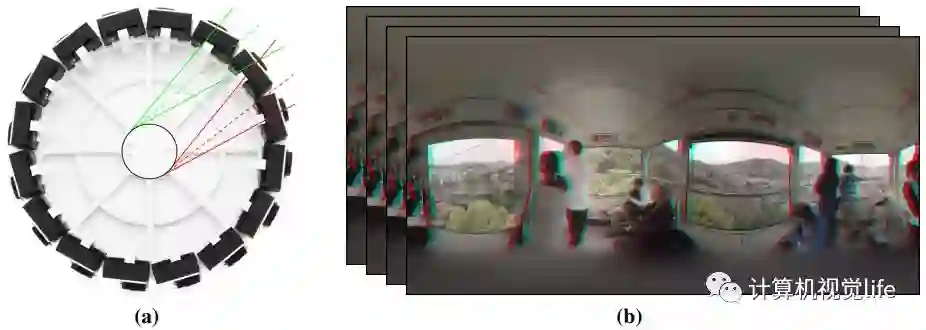 目前具备这样功能的设备主要有两种:Google Jump和Facebook Surround 360(详见《最牛全景相机——Facebook Surround360原理解析》)。本文以Google Jump为例介绍。如下图所示:(a) 是Jump的阵列相机圆盘(b) 通过16个相机拼接好的立体全景视频。