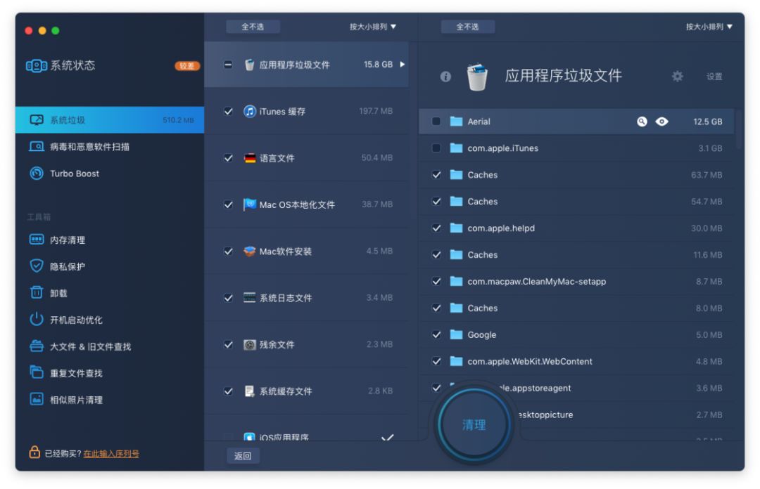 在维护工具中的各项功能中,清理垃圾应该是最基础也是用户最常用的一项了。特别是对于 256GB 容量及以下的 Mac 而言,每次清理系统垃圾都可以空出相当可观的空闲容量。MacBooster 认定的系统垃圾主要包括应用程序缓存、iTunes 缓存、语言文件等,这几项基本上占了垃圾文件的 90%。