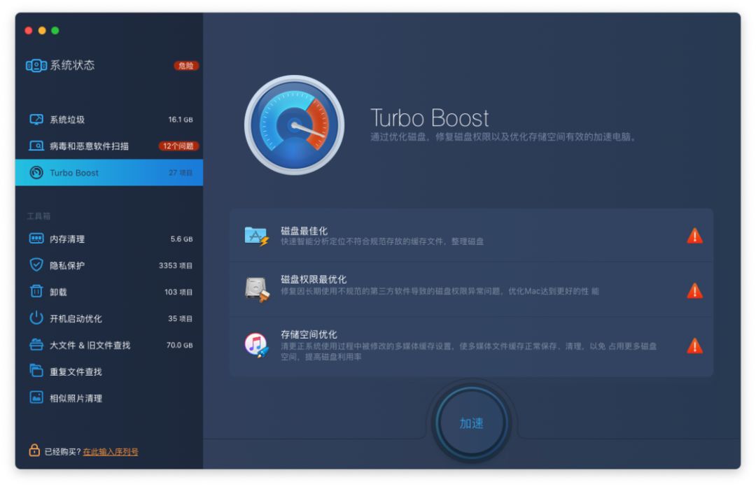 Turbo Boost 可以通过优化磁盘、修复磁盘权限和优化存储空间来让 Mac 性能保持在峰值。第三方应用可能会修改磁盘权限、产生大量缓存文件使系统变慢,利用 Turbo Boost 可以释放相当可观的存储空间,修复磁盘权限并移除那些文件。