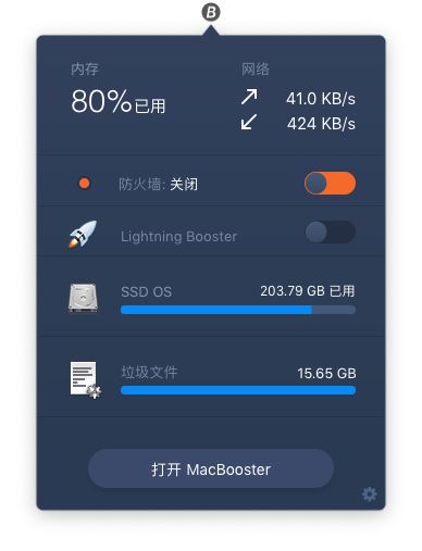 MacBooster 在 Mac 菜单栏会常驻一个小窗口,简要显示当前 Mac 的状态,包括内存占用、网络测速等。我们可以一键释放内存或深度清理文件。打开 Lightning Booster 会使 MacBooster 进行一次系统清理,来快速提高 Mac 性能。我们不必再进入应用,直接在菜单栏就可以进行系统优化。