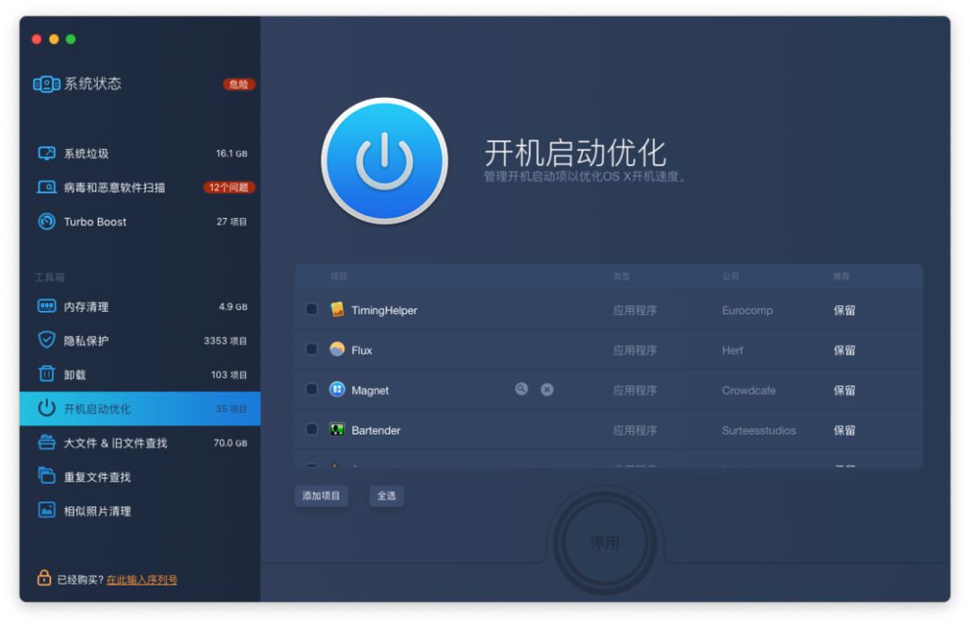 开机启动项优化其实是针对系统偏好设置中的登录项管理做了可视化。一步到位,要比在系统偏好设置里翻找便捷许多。