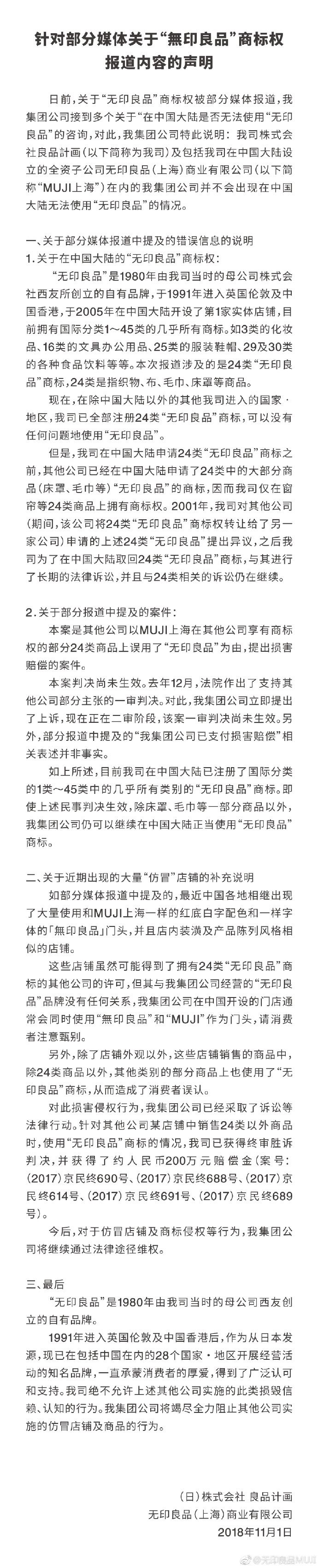 无印良品MUJI在其官方微博发布声明称,不会出现在中国大陆无法使用“无印良品”的情况。此前有报道称,北京棉田纺织品有限公司日前起诉日本无印良品母公司株式会社良品计画以及其中国分公司无印良品(上海)商业有限公司侵犯其商标权并胜诉,无印良品未来在中国销售的产品或只能标示“MUJI”。