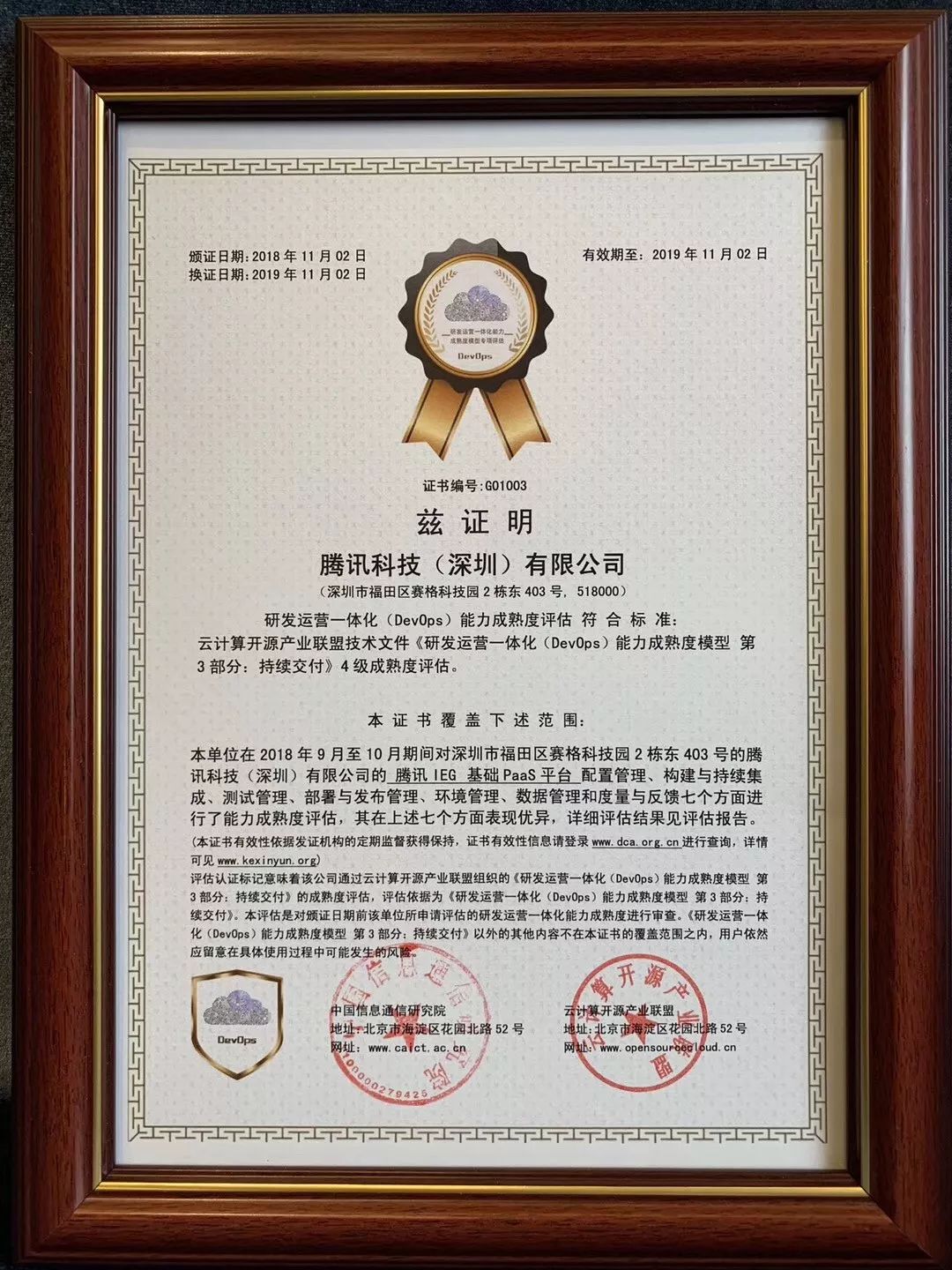 2018年11月2日在深圳召开的 DevOps 国际峰会(DOIS)· 深圳站上,腾讯互动娱乐事业群(IEG)的基础 PaaS 平台获得由工信部中国信息通信研究院主持颁发的《研发运营一体化(DevOps)能力成熟度模型》(即 DevOps 标准)评估证书,证书编号为 G01003。
