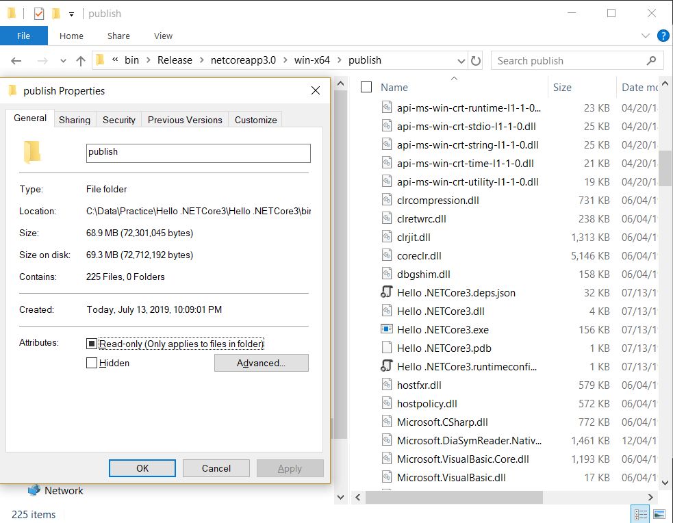 上面的命令执行之后会在创建的发布文件夹中包含 self-contained 可执行程序所需的所有文件,文件数大概有 100 个左右,如果想要在目标计算机上运行这个应用程序,那就需要复制这个发布文件夹内所有文件,似乎并不是那么方便,而且这些文件占用的空间也不算小。