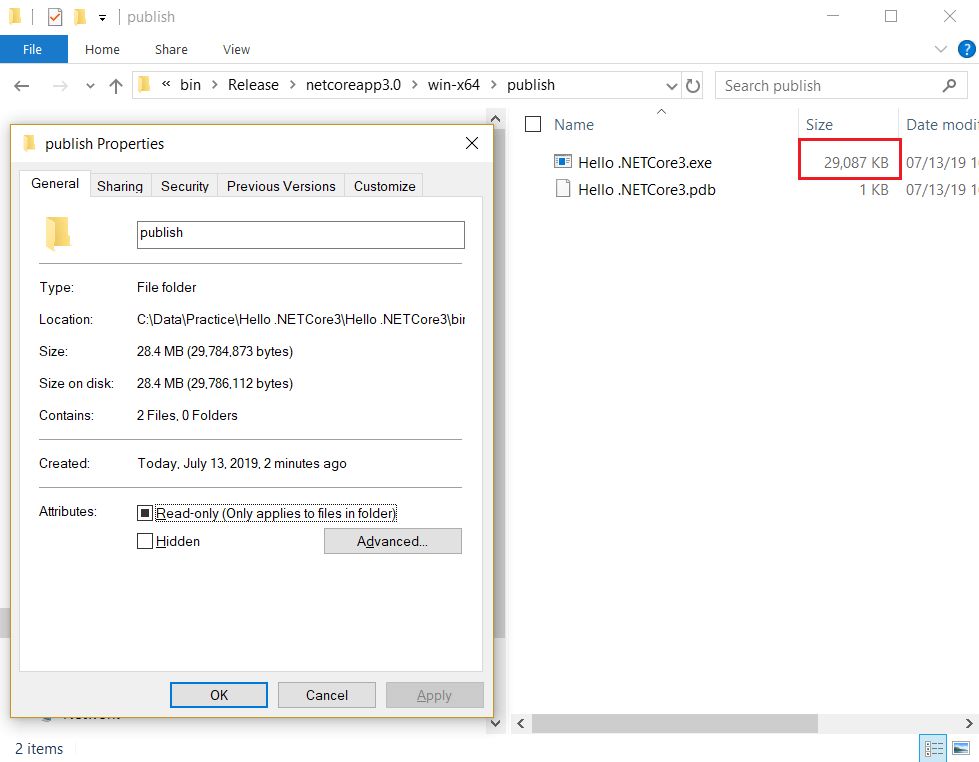 使用上面的两个命令后,您会发现,单体可执行文件的尺寸只有 29MB 了。对于简单的控制台应用程序来说,它仍然有点儿大,但请注意,这是一个包含了 .NET Core 运行时的 self-contained 应用程序。