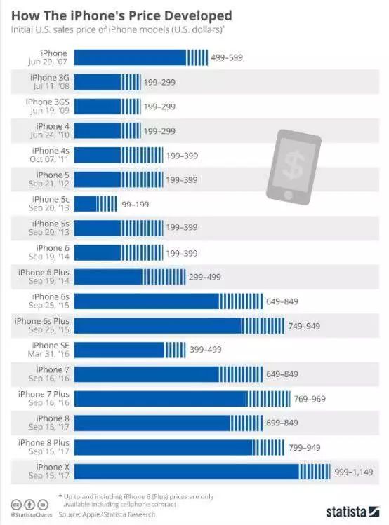 2007年问世的iPhone单价在499美元~599美元之间,2015年攀升到649美元~849美元,去年的iPhone X卖到了999美元~1149美元。最贵的产品贡献了最多的收入,最丰厚的利润。在上市之初的2个月内,iPhone X占据了手机行业总收入的21%和总利润的35%,这就好比S级轿车比C级卖得还多一样,奔驰都做不到。
