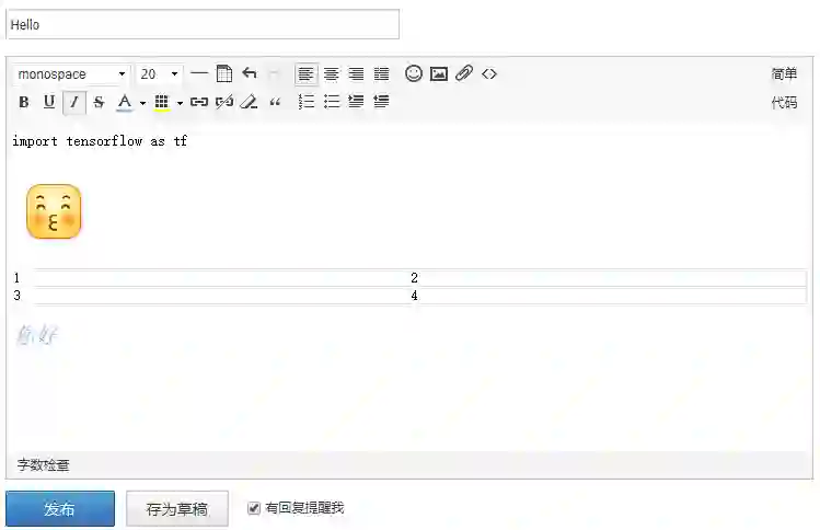 论坛编辑器功能还是比较丰富的,如常用的发表情、插入代码、超链接、图片、表格,上传附件等功能均可实现(遗憾的是目前无法插入视频及编辑公式),更多的功能请各位尽情探索。