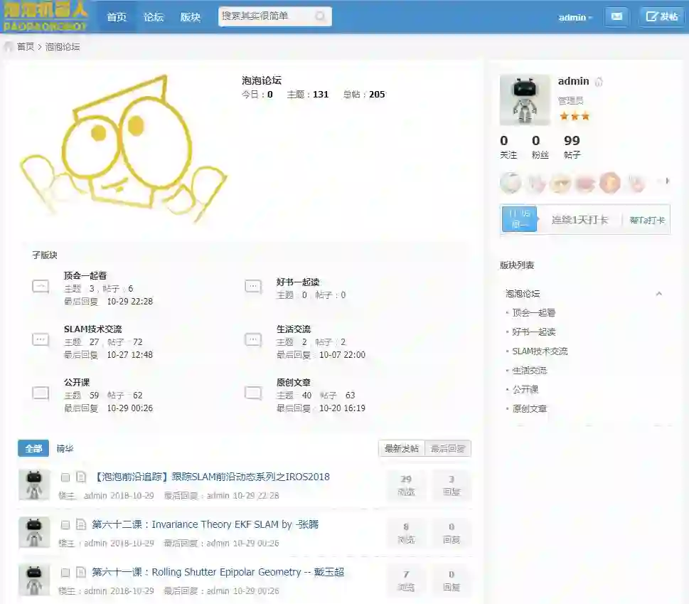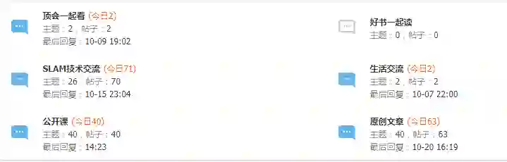 目前论坛分为6大板块,其中好书一起读、公开课、原创文章为旧论坛迁移内容,SLAM技术交流为旧论坛技术讨论内容。新增加了顶会一起看和生活交流两个版块,其中顶会一起看旨在为大家带来最新SLAM相关顶级会议中的前沿资讯、论文解读、资源分享等内容;生活交流专区则可以谈一谈技术、学术之外的一些大家感兴趣的话题,希望各位能在其中找到志同道合的小伙伴。