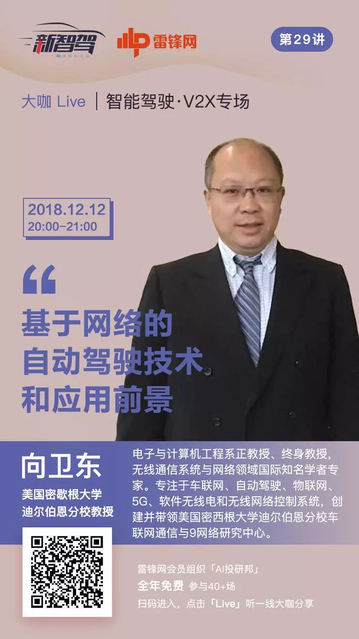 12 月 12 日(周三)晚 8 点,【大咖Live】第 29 期智能驾驶·V2X专场,我们邀请到美国密歇根大学迪尔伯恩分校电子与计算机工程系正教授向卫东详细解析“基于网络的自动驾驶技术和应用前景”。照例,本次分享对「AI投研邦」会员免费开放。