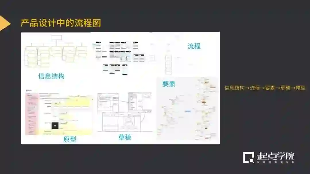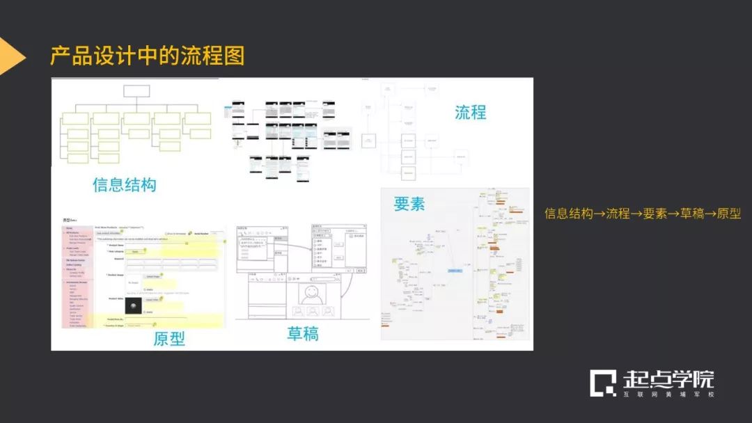 在讲到产品设计中的流程图部分,黄喆老师先帮助大家把设计的思路逻辑梳理出来:信息结构→流程→要素→草稿→原型。