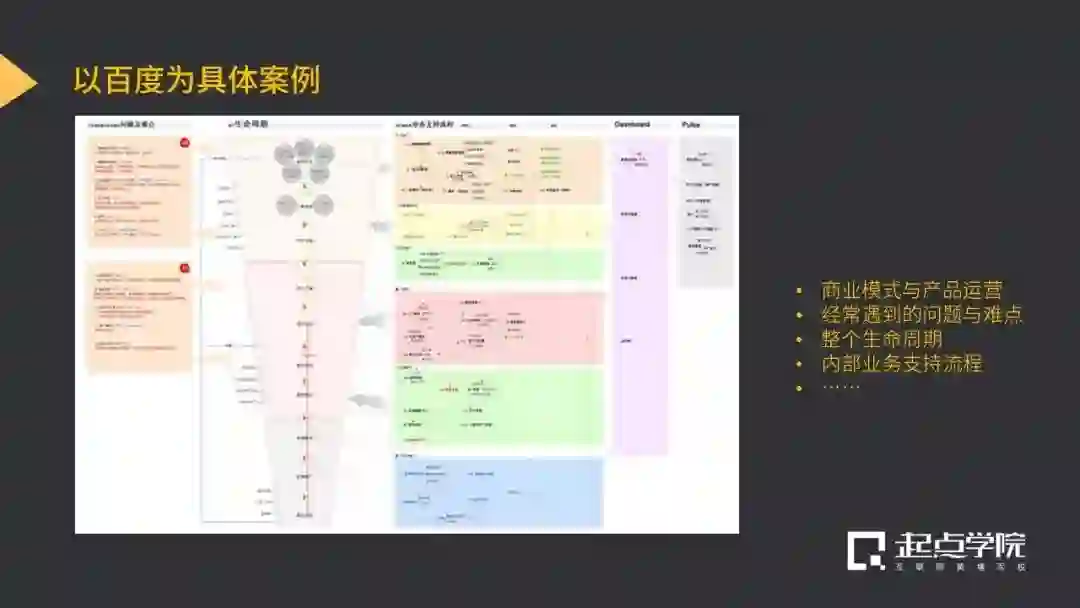 比如在讲到商业模式部分,黄喆老师以百度为具体案例带大家拆解其商业模式与运营产品关系,以及会遇到的问题与难点、整个生命周期、内部业务支持流程等等。