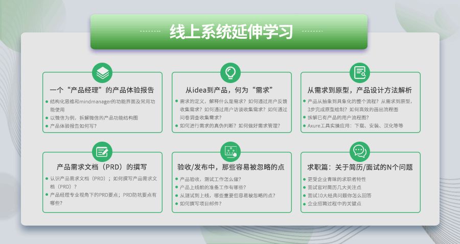 还有一年线上延伸学习课程,为巩固学习,主要是细化学习产品经理的必备知识与技能,包含但不限于一下内容:
