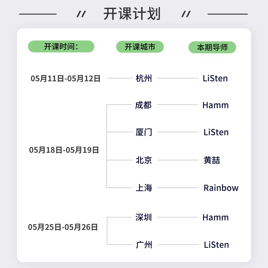 北京、深圳、成都、上海、广州、厦门多城市开课,也可提前抢座~