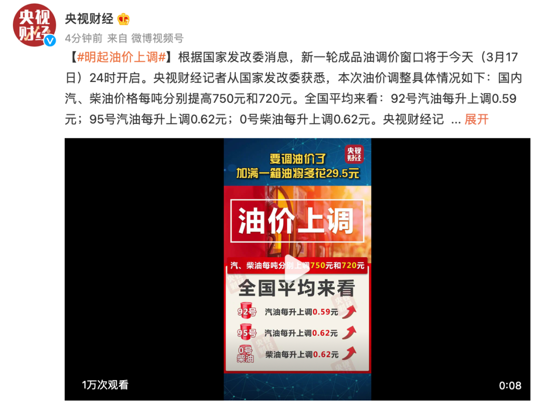 3月17日,国家发改委宣布,自2022年3月17日24时起,国内汽、柴油价格(标准品,下同)每吨分别提高750元和720元,创近九年来最高涨幅纪录。调整后,以北京为例,92号汽油将上涨至8.64元、95号汽油将涨至9.18元。