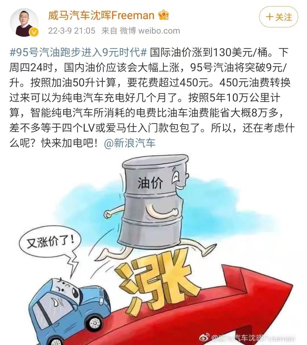 新势力车企大佬忍不住跳了出来。3月9日,威马汽车创始人沈晖借着油价大涨,在微博向大家安利了一波智能纯电动汽车。“智能电动汽车所消耗的电费比油车油费能省大概8万元左右,差不多等于4个LV或爱马仕包。”