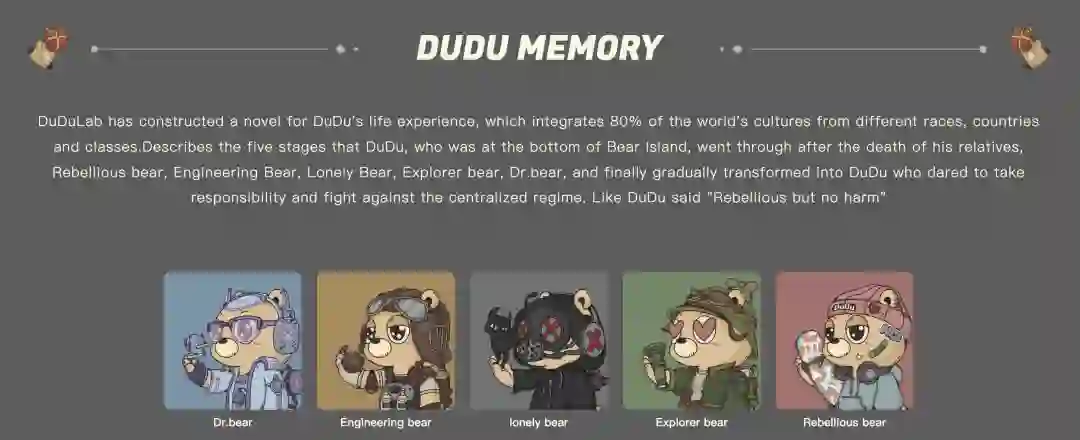 根据官网介绍,DuDuLab为DuDu的人生经历构建了一部长篇小说,它融合了世界不同种族、国家和阶层的文化。描述了处于社会底层的DuDu在亲人去世后所经历的五个阶段:叛逆熊、工程熊、孤独熊、探险家熊、熊博士,最终逐渐蜕变为敢于担当、抗争的DuDu。