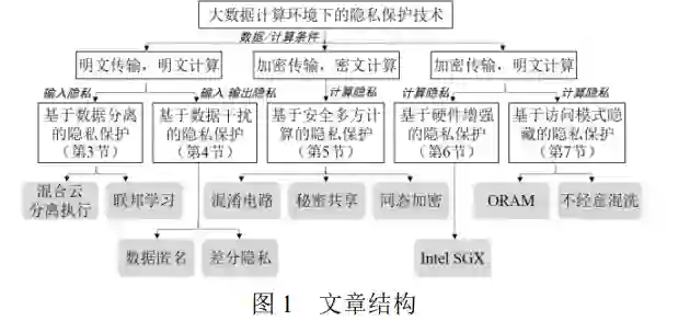 近年来,国内外学者研究了隐私保护技术在数 据挖掘隐私、大数据安全与隐私以及机器学习隐私 等领域的应用,形成了一些综述性的文章:文献[7] 重点分类阐述了数据失真、数据加密和限制发布等 隐私保护技术在数据库领域的应用;文献[8]重点梳 理了基于直方图、基于划分和基于回归分析的差分 隐私技术在数据发布和分析中的应用;文献[9]重点 对比分析了隐私保护数据挖掘(Privacy-Preserving Data Mining, PPDM)中的数据匿名和数据扰动技 术;文献[10]聚焦大数据安全与隐私领域,梳理及 总结了隐私保护、信任和访问控制等角度的关键技 术,包括数据匿名、数据水印、数据溯源和风险自 适应的访问控制等技术;文献[11]从 MapReduce 计 算的数据安全性和隐私性出发,调研并分析了所面 临的安全和隐私挑战、敌手能力以及现有的安全和 隐私协议等内容;文献[12,13]聚焦机器学习隐私, 重点分析和总结了差分隐私、同态加密和安全多方 计算等技术在该领域的研究成果。除此之外,已有 的大多数综述文章侧重于梳理某项或者某类隐私 保护技术的基础理论与应用[130,132],形成专项技术 综述,却缺少对大数据计算全过程面临的隐私问题 及不同隐私保护技术的总结分析。特别是目前大数 据隐私问题严重地影响了计算框架的推广与应用, 因此有必要梳理有关大数据计算隐私的研究进展。本文区别于已有综述文章,重点梳理了与大数 据计算环境相关的隐私保护研究工作。如图 1 所示 为本文结构图,展示了不同隐私保护技术之间的联 系与分类依据。