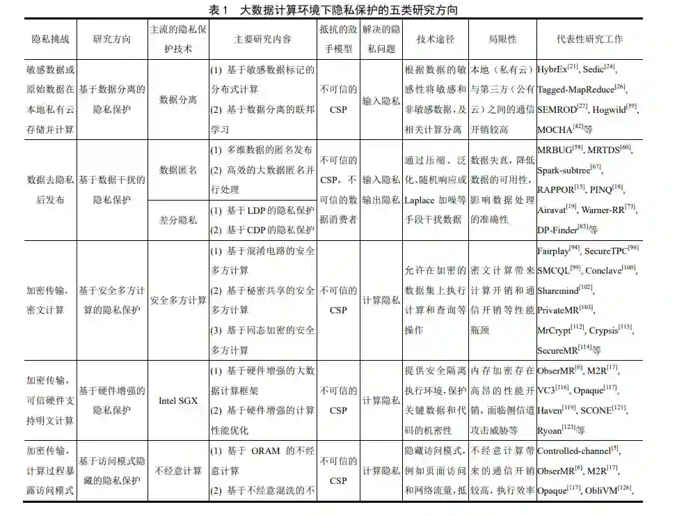 本文对大数据计算环境下的隐私保护技术研 究进展进行了综述。首先分析了大数据计算环境下 的敌手模型、隐私问题与挑战,以及隐私保护的研 究方向;接着,根据隐私保护技术的不同,分别总 结分析了基于数据分离的隐私保护、基于数据干扰 的隐私保护、基于安全多方计算的隐私保护、基于 硬件增强的隐私保护、以及基于访问模式隐藏的隐 私保护等研究方向的最新研究进展,并对比分析了 不同隐私保护技术的优缺点;最后,展望了大数据 计算环境下隐私保护技术的未来研究方向。期望本 文的工作,能给以后的研究者提供有益的参考与借 鉴,为大数据隐私保护的进一步发展做出贡献。综合分析可知,不同隐私保护技术具有不同的 技术特点、局限性和适用场景。在大数据计算环境 下应用隐私保护技术时,数据分离和匿名技术侧重 于在数据输入阶段保护原始数据的敏感信息,其中 数据分离技术主要存在通信开销较高的局限性,适 用于本地或私有云环境具有较强算力的隐私保护 场景,匿名技术实现简单但是主要面临着更强背景 知识攻击的困扰;差分隐私技术侧重于在数据输入 和结果输出阶段扰动数据,在实际应用中计算效率 较高,但是主要存在可用性不高的局限性,适用于 计算节点算力较弱且对隐私保护水平有一定要求 的场景;安全多方计算、Intel SGX 和不经意计算等 技术侧重于在数据计算过程中保护数据的隐私性 和计算的安全性,在实际应用中,安全多方计算主 要存在通信开销较高和执行效率较低的局限性,适 用于多方分布式联合计算的隐私保护场景;Intel SGX 技术需要可信硬件辅助以在安全隔离环境下 执行明文计算,在应用中主要面临侧信道攻击的安 全威胁;不经意计算主要依赖 ORAM 或不经意混 洗手段隐藏访问模式,但是这些手段本身存在低效 性和特殊性,特别是 ORAM 在实际应用中带来了 较高的计算复杂度。因此,未来在大数据计算环境 下应用这些隐私保护技术,仍然存在很多问题需要 亟待解决,其中以下五个问题值得进一步地研究。