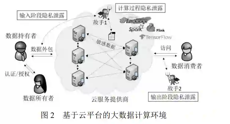 随着云计算与大数据技术的发展,亚马逊、微 软、华为与阿里等主流云服务提供商(Cloud Service Provider, CSP)支持云端部署分布式存储和计算框 架,主要包括批量计算框架(如 MapReduce[1])、流 式计算框架(如 Spark Streaming[2]、Storm1、Flink[3]) 和机器学习框架(如 TensorFlow[4])等,为用户提 供持续可靠、可扩展且高吞吐量的大数据存储和计 算服务。但是,在这种外包的大数据计算环境下, 由于数据所有权和使用权的分离,在计算过程涉及 的数据输入、计算和输出等阶段都有可能发生隐私 数据泄露的风险。因此,如何在大数据计算环境下 保护敏感数据的隐私性(privacy),同时保证数据 的可用性(utility)和计算的高效性(efficiency)成 为大数据隐私保护领域的研究热点之一。