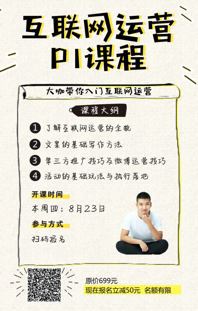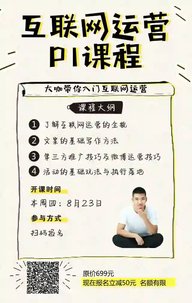 本期即将于周四(8月23日)开课,原价699,现在报名立减50元,但优惠名额有限,想要入门&转行做运营的同学,赶快扫描下方海报中的二维码,前去抢座报名吧!