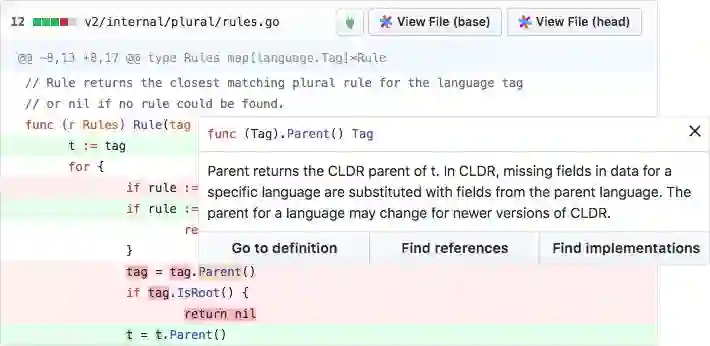Sourcegraph 是一款能够根据语义来把 Web 上的开源代码编入索引的代码搜索浏览工具。你可以从代码仓库和安装包,甚至是函数里搜索代码,同时也可以直接点击被完全创建了链接的代码来阅读文档、跳转到变量定义或者马上找到可用的 Demo。总而言之,你可以在你的 Web 浏览器上完成这一切,而不需要配置任何编辑器。由 Sourcegraph 出品的这款 Chrome 插件,可以非常方便地浏览和搜索 GitHub 上的代码,持跨仓库(repository)搜索、跳转到定义、查找引用等功能,宛若一个功能强大的 IDE。核心功能如跳转到定义(Go-to-definition) —— 浏览文件或查看 pull 请求时,将鼠标悬停在代码上可以查看文档提示,单击即可跳转到定义、查找引用或全文搜索。
