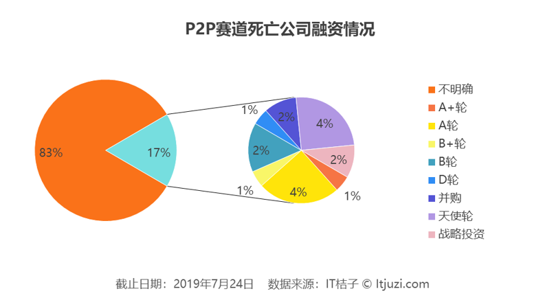纵观 P2P 赛道中死亡公司的融资情况,仅仅 17% 的公司有明确的融资记录,而在这 17% 的公司中,一半的公司融资停留在 B 轮及以前,但不乏有进行到 D 轮或战略融资的 P2P 公司却仍逃不过死亡的结局。