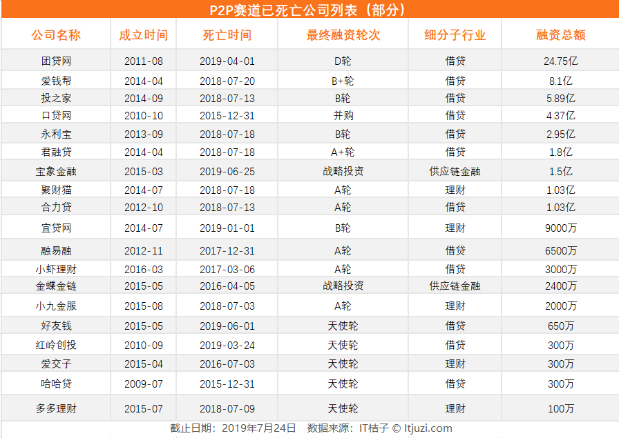 其中,最典型的便数「团贷网"。团贷网成立于 2011 年,是一家专注于小微企业融资服务的互联网金融信息平台,在上线后的一年中,便获得了巨人创投 1 亿元的 A 轮融资;此后的几年内陆续获得来自九鼎投资、民生资本等投资方的三轮投资,共计 23.75 亿。2019 年 3 月,团贷网因涉嫌非法吸收公众存款而暴雷,而这也使拿过近 25 亿融资的团贷网登上死亡公司烧钱榜 Top10。